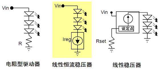 開關(guān)穩(wěn)壓器的能效高,且提供極佳的亮度控制。線性穩(wěn)壓器結(jié)構(gòu)比較簡單,易于設(shè)計,提供穩(wěn)流及過流保護(hù),且沒有電磁兼容性(EMC)問題。