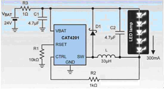 智能樓宇中的備用電源一般為直流24V,市電斷電之后仍需要備用照明長時間的工作,省電是備用照明的重點(diǎn),此時正是電感型轉(zhuǎn)換器LED驅(qū)動器的用武之地。圖3說明了如何利用CAT4201從一個24V電源來驅(qū)動5只1W的LED。