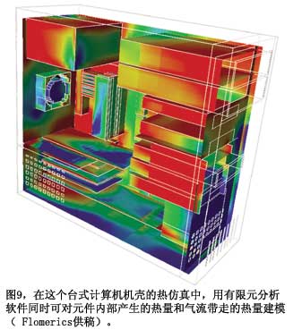 美國(guó)國(guó)家半導(dǎo)體的Webench在線設(shè)計(jì)工具采用Flomerics的Flotherm熱分析軟件,計(jì)算靜止空氣中的器件溫度。所有一般的仿真注意事項(xiàng)均適用。如果你的電路有風(fēng)扇和一些氣流,其溫升就較低。如果有機(jī)箱,里面還有其它器件,其溫升就高。Flomerics采用有限元方案技術(shù)(參考文獻(xiàn)5)。圖9顯示了一個(gè)計(jì)算機(jī)機(jī)殼發(fā)熱與氣流的分析結(jié)果。很多其它有限元解算器也可以分析這種問題。例如,Comsol的一個(gè)解算器可以完成多重物理分析,可以解算超過一個(gè)問題的偏微分方程,如一只部件的熱響應(yīng),部件的導(dǎo)熱性能隨其溫度而變化。TI的Edwards指出,他的公司提供二種級(jí)別的熱建模抽象:ΦJB熱阻,以及Delphi緊湊模型標(biāo)準(zhǔn)。Flotherm、Icepak和很多其它熱分析程序都使用這些模型。