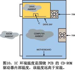 無疑,當(dāng)大多數(shù)工程師沒有理解環(huán)境溫度的嵌套程度時(shí),他們就會(huì)失敗。例如,假設(shè)要設(shè)計(jì)一個(gè)部件,用于CD播放機(jī)的光學(xué)拾取裝置(圖10)。你可能會(huì)這么假設(shè),由于該部件用于消費(fèi)產(chǎn)品,它可能工作在0℃~70℃。但好好想想吧。實(shí)驗(yàn)室工作臺(tái)上的部件可能是工作在25℃環(huán)境下。而光功率件是要安裝在CD驅(qū)動(dòng)器里,驅(qū)動(dòng)器中有其它元件在加熱空氣,該裝置可能不裝風(fēng)扇。更糟糕的是,播放機(jī)裝在計(jì)算機(jī)內(nèi),驅(qū)動(dòng)器必須工作在這種環(huán)境溫度下。計(jì)算機(jī)內(nèi)部有自己的熱源和風(fēng)扇,這個(gè)溫度上再加上外部環(huán)境溫度,因此,在工作臺(tái)上測(cè)得的25℃室溫,到了計(jì)算機(jī)內(nèi)就是40℃,CD驅(qū)動(dòng)器內(nèi)是50℃。現(xiàn)在,如果你把計(jì)算機(jī)放在厄瓜多爾的一個(gè)很熱的閣樓上,情況又該如何?這個(gè)部件必須工作在遠(yuǎn)高于70℃的環(huán)境溫度下。你的職責(zé)是確保它仍能滿足規(guī)范,并且高溫不會(huì)顯著縮短產(chǎn)品的壽命。