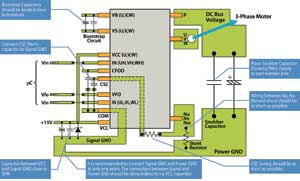 與電壓源變頻器的分立元件方案類似,采用智能功率模塊時也要注意外部元件的布局安排。圖3所示為針對Motion-SPMTM應用的一些建議。由于電壓源變頻器的開關速率很快,信號接地和功率接地必須分開。兩種接地在15VVcc電容處互接。Vcc電容和功率接地之間的通道要狹窄,以去除耦合。為防止電涌造成破壞,引腳P與功率接地之間應當有一個低電感電容。另外,由于電壓源變頻器和馬達之間的長引線會造成高壓反射,因此一些SPM產品配備了外接柵極電阻來調節開關速率和最大限度地減少反射。