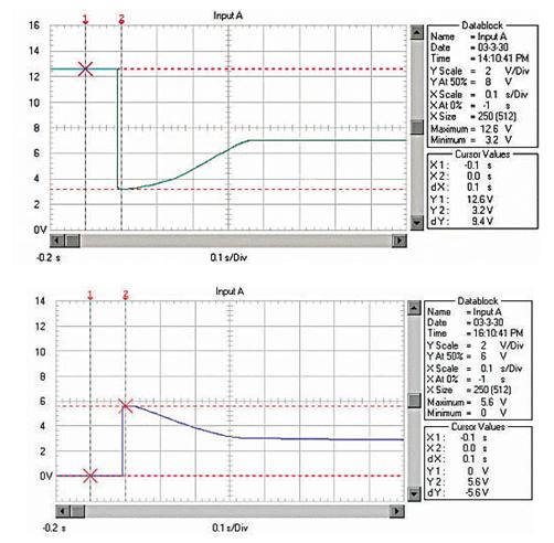 由于RM、RB、RL均非常低,啟動(dòng)電流非常大。例如用12V、45Ah的蓄電池啟動(dòng)安裝1.9升柴油機(jī)的汽車,蓄電池的電壓在啟動(dòng)瞬間由12.6V降到約3.6V!啟動(dòng)過(guò)程的蓄電池電壓波形如圖1;啟動(dòng)瞬時(shí)的電流達(dá)550A,約為蓄電池的12C的放電率!啟動(dòng)過(guò)程的蓄電池電流波形如圖2,(電流傳感器的電流/電壓變換比率:100A/V)。盡管車用蓄電池是啟動(dòng)專用蓄電池,可以高倍率放電,但在圖1中可以看出,10倍以上的高倍率放電時(shí)的蓄電池性能變得很差,而且,如此高倍率放電對(duì)蓄電池的損傷也是非常明顯的。啟動(dòng)過(guò)程的電壓劇烈變化也是極強(qiáng)的電磁干擾,可以造成電氣設(shè)備的“掉電”,迫使電氣設(shè)備在發(fā)電機(jī)啟動(dòng)過(guò)程結(jié)束后重新上電,計(jì)算機(jī)在這個(gè)過(guò)程中非常容易死機(jī)。因此,無(wú)論從改善汽車電氣設(shè)備的電磁環(huán)境還是改善汽車的啟動(dòng)性能和蓄電池的性能、延長(zhǎng)使用壽命來(lái)考慮,改善汽車電源在啟動(dòng)過(guò)程的性能是必要的。