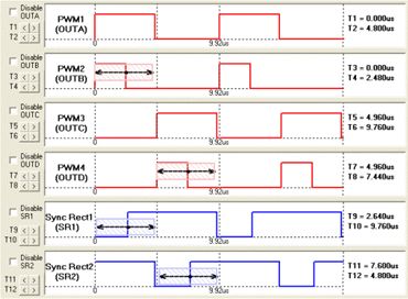 因此,為最大限度地提高效率,要求死區(qū)時間盡可能小。但是在傳統(tǒng)的模擬方案中,自驅(qū)動型除了應用的限制外,還很難提供精確的控制時序;對于外驅(qū)動型,由于其參數(shù)是由電阻、電容等無源器件進行設(shè)定,存在誤差、老化、溫漂等問題,為保證有足夠的余量,死區(qū)時間也不可能設(shè)置得很小。因此,ADP1043的數(shù)字方案是很好的選擇。圖2所示為ADP1043在全橋拓撲電路下的PWM和SR的GUI設(shè)置界面。通過設(shè)置T9、T10、T11和T125便可精確獲得同步整流MOSFET所需的死區(qū)時間,其中每次調(diào)整的最小時間為5ns。