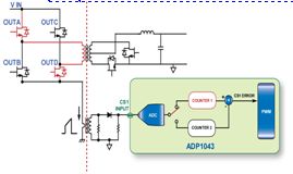 在傳統(tǒng)的橋式拓撲電路中,一般為防止變壓器的偏磁,會在變壓器的原邊回路中串入一個隔直電容器。這樣做存在缺點,一方面是增加了電源的成本和體積,另一方面又增加了損耗,降低了效率。ADP1043采用伏秒平衡控制的數(shù)字技術(shù)解決了該問題。如圖3所示,在每個開關(guān)周期中,ADP1043通過CS1分別測量流過開關(guān)管A、D和開關(guān)管B、C的電流并計算其差值,通過差值信號調(diào)節(jié)驅(qū)動信號OUTB和OUTD的脈寬,對失衡進行補償。