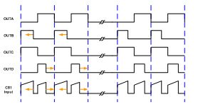 例如,如圖4所示,當CS1測量到流過開關(guān)管B、C的電流大于開關(guān)管A、D時,便會減小OUTB的脈寬,增大OUTD的脈寬,這樣流過開關(guān)管B、C的電流會減小,而流過開關(guān)管A、D的電流會增大,經(jīng)過若干周期后,電流自動實現(xiàn)了平衡。采用該技術(shù)后,可有效防止偏磁,并且省去隔直電容器,提高效率和可靠性。