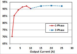 但是,隨著負載的減少,電路進入輕載狀態(tài),開關(guān)管的開關(guān)損耗逐漸占主導,此時,輸出由一相供電就已經(jīng)足夠,多相的并聯(lián)反而使開關(guān)損耗成倍增加。因而,在輕載時,僅留一相工作,關(guān)閉多相模式,可以明顯改善電路在輕載時的效率。如圖7所示,為采用ADP1043所設(shè)計的交錯式雙管正激電路。當輸出電流值低于通過GUI所設(shè)置的閾值時,ADP1043便會關(guān)閉QA2、QB2的驅(qū)動信號,以減少損耗。圖8所示為采用切相技術(shù)的電源的效率曲線,可以發(fā)現(xiàn)當輸出電流低于10A時,電源工作在單相模式下,效率有了明顯的提高。