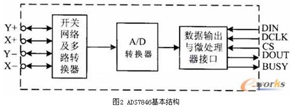 觸摸屏控制器有多種,主要的功能均是在微處理器的控制下向觸摸屏的兩個方向分時施加電壓,并將相應的電壓信號傳送給自身A/D轉換器,在微處理器SPI口提供的同步時鐘作用下將數字信號讀入微處理器。控制器ADS7846基本結構如圖2所示。