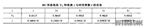 根據公式計算在不同時間內的Vc和i,其結果見表1。從表中可以看出,r越大充電越慢。當t=3r時,Vc=0.95E;當t=5r時,Vc=0.993E;一般認為當 t=(3-5)r時,電容器上的電荷已被充滿。