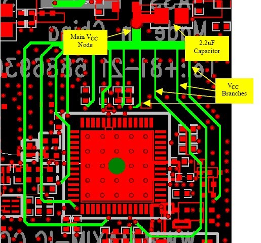 設計RF電路時,電源電路的設計和電路板布局常常被留到高頻信號通路的設計完成之后。對于沒有經過深思熟慮的設計,電路周圍的電源電壓很容易產生錯誤的輸出和噪聲,從而對RF電路的系統性能產生負面影響。合理分配PCB的板層、采用星形拓撲的VCC引線,并在VCC引腳加上適當的去耦電容,將有助于改善系統的性能,獲得最佳指標。合理的PCB層分配便于簡化后續的布線處理,對于一個四層PCB(WLAN中常用的電路板),在大多數應用中用電路板的頂層放置元器件和RF引線,第二層作為系統地,電源部分放置在第三層,任何信號線都可以分布在第四層。第二層采用不受干擾的地平面布局對于建立阻抗受控的RF信號通路非常必要,還便于獲得盡可能短的地環路,為第一層和第三層提供高度的電氣隔離,使得兩層之間的耦合最小。當然,也可以采用其它板層定義的方式(特別是在電路板具有不同的層數時),但上述結構是經過驗證的一個成功范例。大面積的電源層能夠使VCC布線變得輕松,但是,這種結構常常是導致系統性能惡化的導火索,在一個較大平面上把所有電源引線接在一起將無法避免引腳之間的噪聲傳輸。反之,如果使用星形拓撲則會減輕不同電源引腳之間的耦合。圖1給出了星形連接的VCC布線方案,該圖取自MAX2826IEEE802.11a/g收發器的評估板。圖中建立了一個主VCC節點,從該點引出不同分支的電源線,為RFIC的電源引腳供電。每個電源引腳使用獨立的引線,為引腳之間提供了空間上的隔離,有利于減小它們之間的耦合。另外,每條引線還具有一定的寄生電感,這恰好是我們所希望的,它有助于濾除電源線上的高頻噪聲。