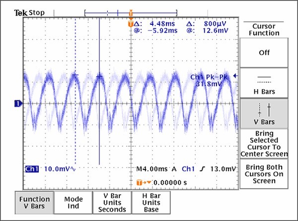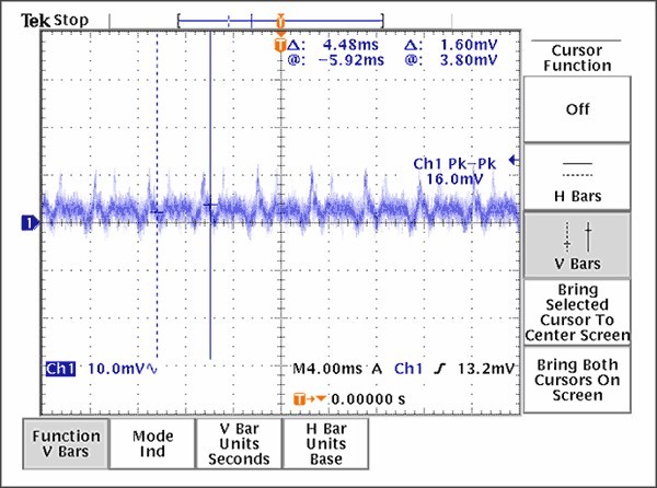 經驗證明,抑制PLL雜散的有效途徑是合理的接地、電源布局和去耦技術,本文討論的布線原則是減小PLL雜散分量的良好設計開端。考慮到電荷泵中存在較大的電流變化,采用星形拓撲非常必要。如果沒有足夠的隔離,電流脈沖產生的噪聲會耦合到VCO電源,對VCO頻率進行調制,通常稱為“VCO牽引”。通過電源線間的物理間隔和每個VCC引腳的去耦電容、合理放置接地過孔、引入一個串聯的鐵氧體元件(作為最后一個手段)等措施可以提高隔離度。上述措施并不需要全部用在每個設計中,適當采用每種方式都會有效降低雜散幅度。圖9提供了一個由于不合理的VCO電源去耦方案所產生的結果,電源紋波表明正是電荷泵的開關效應導致電源線上的強干擾。值得慶幸的是,這種強干擾可以通過增加旁路電容得到有效抑制。圖10顯示的是在電路改變后,在同一點的測量結果。