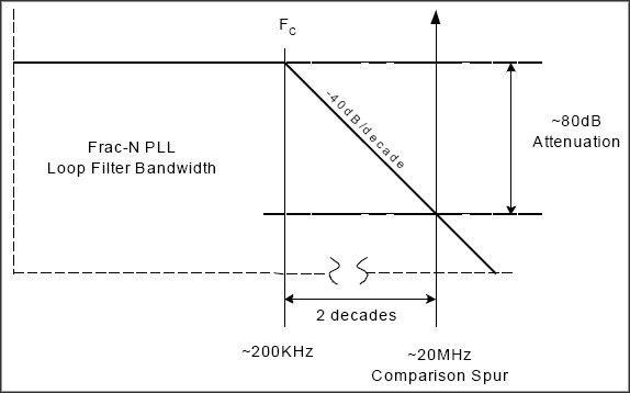 上述討論提出了另外一個問題,即如何有效地將PLL雜散成分限制在一定的范圍內,使其不對發射頻譜產生影響。一旦發現了雜散成分,首先想到的方案就是將PLL環路濾波器的帶寬變窄,以便衰減雜散信號的幅度。這種方法在極少數的情況下是有效的,但它存在一些潛在問題。圖8給出了一種假設情況,假設設計中采用了一個具有20MHz相對頻率的N分頻合成器,如果環路濾波器是二階的,截止頻率為200kHz,滾降速率通常為40dB/十倍頻程,在20MHz頻點可以獲得80dB的衰減。如果參考雜散成分為-40dBc(假設可以導致有害的調制分量的電平),產生雜散的機制可能超出環路濾波器的作用范圍(如果它是在濾波器之前產生的,其幅度可能非常大)。壓縮環路濾波器的帶寬將不會改善雜散特性,反而提高了PLL鎖相時間,對系統產生明顯的負面影響。