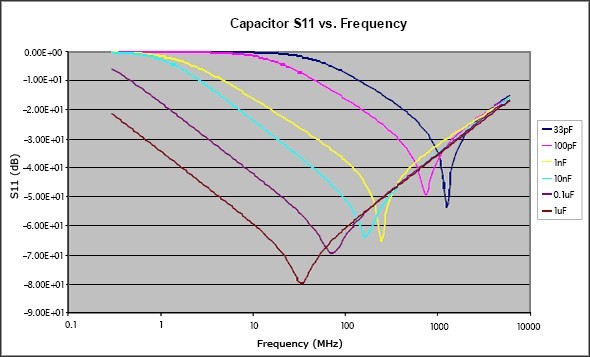 使用星形拓撲VCC引線時,還有必要采取適當的電源去耦,而去耦電容存在一定的寄生電感。事實上,電容等效為一個串聯的RLC電路,如圖2所示,電容在低頻段起主導作用,但在自激振蕩頻率(SRF) 之后,電容的阻抗將呈現出電感性。由此可見,電容器只是在頻率接近或低于其SRF時才具有去耦作用,在這些頻點電容表現為低阻。圖3給出了不同容值下的典型S11參數,從這些曲線可以清楚地看出它們的SRF,還可以看出電容越大,在較低頻率處所提供的去耦性能越好(所呈現的阻抗越低)。