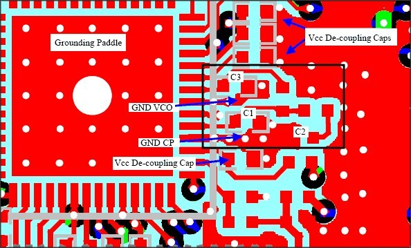 濾除其它電路的噪聲、抑制本地產生的噪聲,從而消除級與級之間通過電源線的交叉干擾,這是VCC去耦帶來的好處。如果去耦電容使用了同一接地過孔,由于過孔與地之間的電感效應,這些連接點的過孔將會承載來自兩個電源的全部RF干擾,不僅喪失了去耦電容的功能,而且還為系統中的級間噪聲耦合提供了另外一條通路。在本文第三部分的討論中將會看到,PLL的實現在系統設計中總是面臨巨大挑戰,要想獲得滿意的雜散特性必須有良好的地線布局。