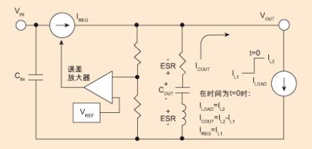 在穩(wěn)壓器的電流源被控制環(huán)路調(diào)整到新值之前的時(shí)間間隔內(nèi),ESR兩側(cè)的分壓降低了輸出電壓(這段時(shí)間內(nèi)COUT放電電荷量也會(huì)相應(yīng)有所減少)。