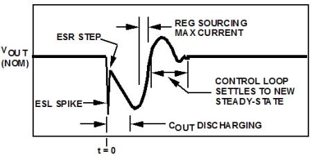 所有的電容都含有ESR和ESL,二者都會(huì)對(duì)瞬態(tài)響應(yīng)產(chǎn)生明顯的影響。在一個(gè)增加的電流負(fù)載瞬變過程中看到的輸出電壓與圖2中顯示的類似。