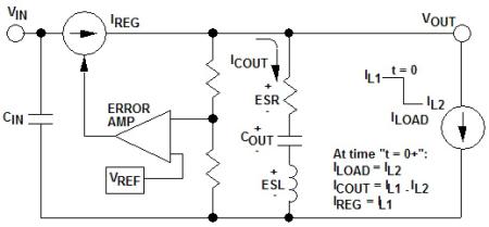 穩(wěn)壓器的電流源(IREG)不能立即發(fā)生變化,因此在“t = 0+”時(shí)刻(也就是負(fù)載電流增加到IL2的瞬間),IREG = IL1。通過簡(jiǎn)單節(jié)點(diǎn)分析得出,此時(shí)電流源需要輸出電容: