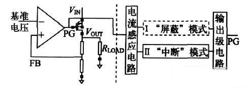 包含過流保護電路的LDO整體框圖如圖2所示,虛線左邊是LDO 主體電路,包括誤差放大器、功率管、負載電阻以及分壓電阻。虛線右邊部分為電流保護電路,主要作用是感應并檢測負載電流是否超過限制電流,然后通過控制功率管來決定是否使LDO 中斷運行,包括電流感應電路和控制電路。傳統的過流保護電路只采用圖2 中實框Ⅱ所示的“中斷”模式(不包括虛框),對于任何負載過流情況,不論持續作用時間如何,都使LDO 中斷工作;本文在傳統的“中斷”模式基礎上,增加了“屏蔽”模式(如圖2 中虛框Ⅰ),能有效屏蔽希望LDO不中斷工作的過流信號,使LDO更高效運行,同時保留“中斷”模式,保證LDO 安全工作。