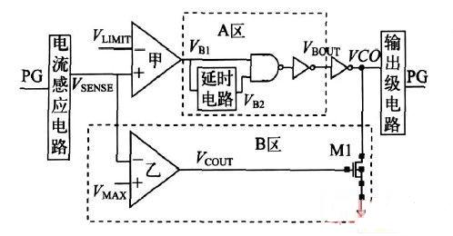 圖3 虛框B 區電路能解決屏蔽時間內大電流可能導致功率管瞬間燒毀的問題,當延遲時間內出現很大過流信號時,能及時關斷功率管,保證系統安全。關斷電路由比較器乙和NMOS 開關管M1 組成。