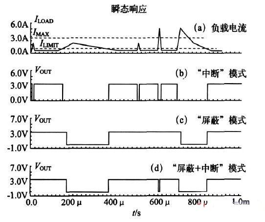 圖5 中(a)曲線表示負載電流幅值和作用時間的關系,ILIMIT 和IMAX 分別為限制電流和最大幅值電流。圖5 中(b)、(c)和(d)曲線分別為采用傳統“中斷”模式、“屏蔽”模式以及“屏蔽+ 中斷”模式過流保護電路后LDO 的輸出電壓波形。