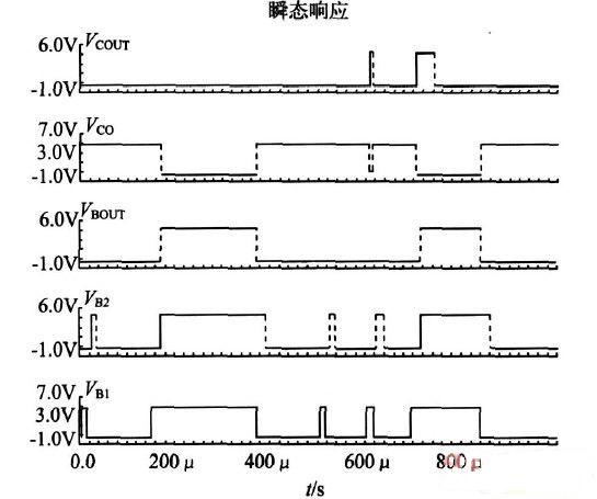 “屏蔽”模式的邏輯關系如圖4 所示,其中VB1和VCOUT 分別為比較器甲和乙的輸出信號,VB1 經過一個延遲時間后輸出信號為VB2,屏蔽電路輸出電壓為VBOUT,VCO為屏蔽電路的輸出端。VB1、VB2和VBOUT的波形反應了屏蔽電路的邏輯關系,只有當VB1 和VB2 同時為高電平,VBOUT 才為低電平,否則VBOUT 一直為高電平,因此屏蔽電路屏蔽了延遲時間內的脈沖信號,保持寬脈沖信號;VCOUT為使能端,只要VCOUT為高電平,VCO 立即變為低電平。