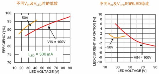 典型高壓降壓LED驅動器性能如圖5所示,從圖中可以看出當Vf/Vin大于0.8時,CAT4201可以提供93%至95%范圍的能效。