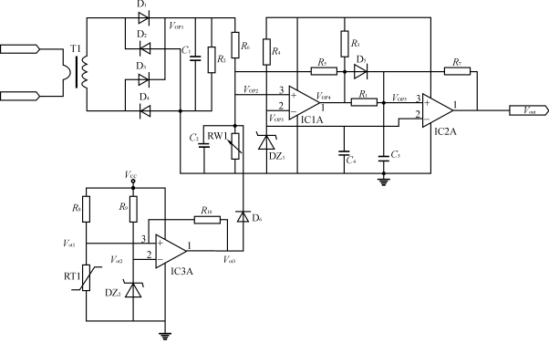 借助上述電路我們可以很容易地構成,輸入過、欠壓保護,輸出過、欠壓保護,以及過熱保護。在此僅以附加過熱保護為例,說明如下:如圖1所示,過熱保護線路是由IC3A及其周邊元件組成。當電源的溫度沒有超過設定溫度時,Vot1<Vot2,運放IC3A的輸出電壓Vot3為低電平,由于有二極管D6的存在,此時IC3A的輸出電壓Vot3不會影響到VOP2的電壓,也就是說在過熱保護線路未起作用時,它不會影響到上述的過流保護線路的性能。當電源的溫度超溫時Vot1>Vot2,運放IC3A的輸出電壓Vot3變?yōu)楦唠娖剑ㄟ^二極管D6,使VOP2的電壓升高,從而觸發(fā)過流保護線路使電源進入停止工作期。只有當電源溫度降低到超溫保護點以下時,電源才能重新進入正常工作狀態(tài)。依此類推可以構成其它輸入輸出過、欠壓保護線路。在此不再贅述。