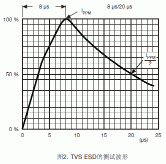 TVS的額定功率是在一定測試或應(yīng)用條件下吸收浪涌的能力。10μs/1000μs脈沖波形的工業(yè)標(biāo)準(zhǔn)測試條件(Bellcore 1089標(biāo)準(zhǔn))如圖1所示。這個(gè)測試條件不同于8μs/20μs脈沖波形的TVS瞬態(tài)電壓吸收能力測試條件,如圖2所示。