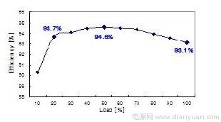 轉換器的效率如圖 7 所示,在額定負載為 20%、50% 和 100% 的情況下測得的效率分別為93.7%、94.6% 和 93.1%,這顯示了邊際性能,因而使用設計優良的 PFC 和 DC-DC 級能夠達到85 PLUS 規范要求。