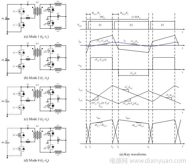 當 S2 關斷,模式 1 作為另一個重建模式而開始,模式 1 的運作原理幾乎與模式 3 相同,只有 ZVS 狀況例外。在模式 1 中,當 S1 的輸出電容電壓等于 Vin-VCb 的瞬間,vT1 成為零。在這個瞬間之前,輸出電感 LO2 上的負載電流反射到變壓器的初級端,有助于實現開關的 ZVS 運作。與此相反,存儲在漏電感中的能量僅在這個瞬間之后對輸出電容進行放電和充電。因而,S1的 ZVS 運作較 S2 更為穩固,因為通常 Vin-VCb 高于 VCb ,除此之外,可以與模式 3 相同的方式進行分析,模式 1 的延續時間為