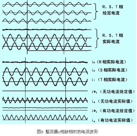 如果由于線路缺相,CT也檢測不到電流(例如r相電流ir=0),則由于平衡控制會使另外兩相電流的相位差變?yōu)?80°,幅值相等(當然為補償“缺相”的那相電流,另兩相電流將增大),以滿足矢量和為零的控制要求,如圖8所示。此時,根據(jù)r、s、t相實際電流計算出的有功分量電流iq和無功分量電流id已經(jīng)不是正常直流量,而是含有2倍頻(相電流頻率)成份的交流量,參見圖8,整流器無法正常工作。