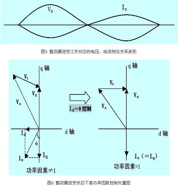 我們希望整流器不論是工作在整流狀態(tài)還是逆變狀態(tài)其功率因素都等于1.0,因此整流器工作在逆變狀態(tài)時,只要做到is與vs的相位是反相的,功率因數(shù)同樣可控制在1.0,這時能量是往電網(wǎng)方向流動的。如圖5和圖6所示。