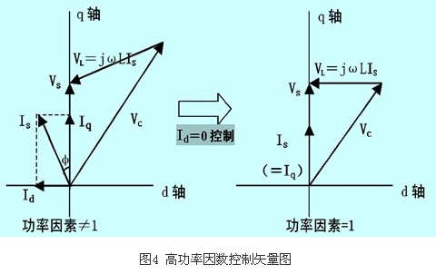 根據(jù)圖4可以知道,要把整流器的功率因數(shù)控制在1.0的話,只要把無功電流設(shè)定值設(shè)為0(id﹡=0),通過整流器控制系統(tǒng)調(diào)節(jié)改變輸出電壓vc的大小和相位,使實際無功電流分量id=0,那么is=iq+id=iq,is就能與vs保持在同相位,功率因數(shù)控制到了1.0。