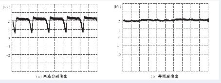 通過小功率試驗(yàn)的驗(yàn)證,證明了該方案的可行性,采用本方案可以在較低的工作頻率下達(dá)到輸出低紋波直流電壓的目的,可以減小半導(dǎo)體開關(guān)元件的損耗,提高元器件使用壽命和設(shè)備的穩(wěn)定性,同時對控制等輔助電路的要求也降低;另外并聯(lián)后輸出電壓的脈動頻率高且幅值小,容易濾波,所以可以減小輸出端的濾波電容。由于電路是兩路電源并聯(lián)的結(jié)構(gòu),可以提高電源的輸出容量。