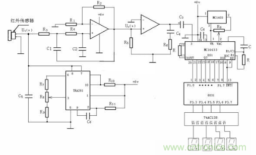 按照上述設計原理,設計的二氧化碳檢測電路如圖3所示。工作原理是首先由紅外傳感器將探測到二氧化碳氣體的濃度并轉換成電信號,濾波電路提取電信號并輸出到放大電路,經過單片機系統處理后輸出,再由74AC138送入顯示電路,以實現對二氧化碳氣體濃度的檢測。