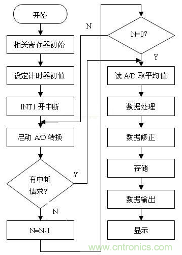 檢測處理程序流程框圖如圖4所示。采用MCS系列匯編語言〔5〕編程,由于有硬件設計的保證,使得整個系統既可以工作在循環查詢的方式,也可工作在中斷管理的方式。