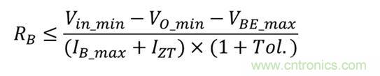 電阻器RB可為齊納二極管和晶體管基極提供電流。在運行條件下,它應提供足夠的電流。齊納二極管反向電流IZ應大于1mA,正如筆者在“齊納二極管Dz的選擇”部分所討論的。方程式2可估算出運行所需的最大基極電流: