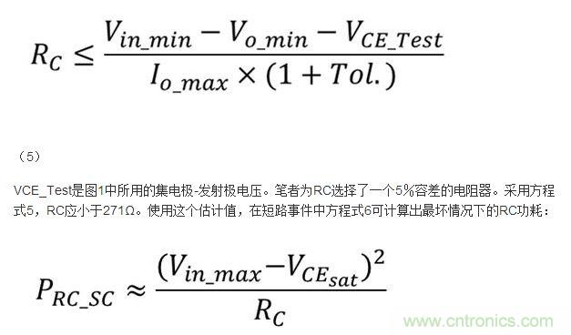 電阻器RC將會滿足輸出調節要求,并能在短路事件中耗散功率。筆者可計算出RC的值: