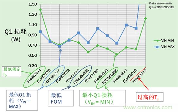 對于Q2,VIN= VINMAX時損耗最大。圖3所示的12個器件中,FDMS7656AS有最低的最大損耗。但由于Q2 寄生參數會影響Q1的 開關損耗, 最小Q2 損耗通常并不意味著最佳的總能效。必須比較Q1及Q2的總功耗來找到最佳的Q2以實現最高能效。