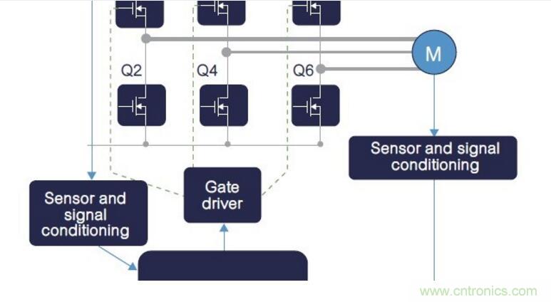 在電橋拓?fù)鋬?nèi),反向恢復(fù)過程從下橋臂開關(guān)(圖7中的Q2)續(xù)流結(jié)束時(shí)開始,到上橋臂開關(guān)(圖7中的Q1)開始導(dǎo)通時(shí)終止,且最終的恢復(fù)電流加到上橋臂電流內(nèi)。連同上橋臂開關(guān)上的額外電流,下橋臂反向恢復(fù)過程與Vds≈0V到Vdc換向操作,可能會(huì)在下橋臂開關(guān)閘源電壓上產(chǎn)生雜散跳變電壓,因?yàn)橄聵虮?/font>Ciss(輸入電容)是透過Crss(Miller電容)完成充電過程。
