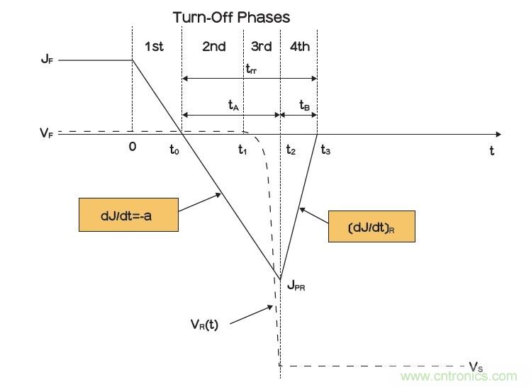 當(dāng)二極管正向偏壓變成反向偏壓時(shí),電流不會(huì)立即降至零值,因?yàn)橄☉B(tài)期間儲(chǔ)存的電荷需要時(shí)間。因此,當(dāng)t=t0時(shí),二極管開始換向操作,電流開始下降,下降斜率(-a)恒定,外部電感和電源電壓是決定斜率的唯一因素。在t1之前,二極管被施加正向偏壓,從t1到t2,二極管壓降上升,達(dá)到電源電壓;在t=t2時(shí),反向電流達(dá)到最大值。間隔(t3-t0)被稱為反向恢復(fù)時(shí)間(trr),而負(fù)電流與零線之間的區(qū)域是反向恢復(fù)電荷(Qrr)。tB期間的電流斜率主要與產(chǎn)品設(shè)計(jì)和硅特性有關(guān)。