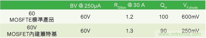 當(dāng)只有優(yōu)化Qrr和VF,diode才能提高系統(tǒng)總體性能時(shí),集成肖特基二極管的新60V MOSFET是一個(gè)正確選擇。圖3列出了標(biāo)準(zhǔn)MOSFET和集成肖特基的功率開關(guān)的主要電參數(shù)(兩款產(chǎn)品的BVDSS和芯片尺寸相同)。
