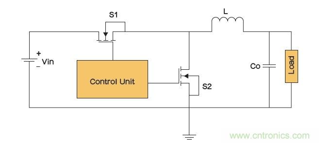 在一個(gè)同步降壓轉(zhuǎn)換器(圖4)內(nèi),集成肖特基二極管的功率MOSFET可以用作下橋臂開關(guān)(S2),以提高轉(zhuǎn)換器的總體性能。