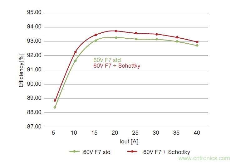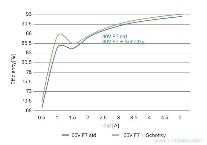 在兩個(gè)拓?fù)鋬?nèi),60V內(nèi)置肖特基二極管的器件在整個(gè)電流范圍內(nèi)性能表現(xiàn)更好,從而提高了系統(tǒng)總體性能。