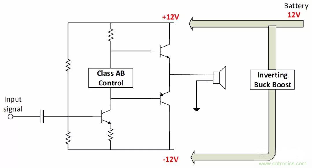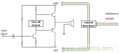 為這類應用選擇合適的拓撲時,需要考慮輸入電壓。例如,為以±12V軌運行的音頻放大器供電,如果輸入電源軌是24V,就選擇隔離式降壓拓撲。如果使用12V電池,就可以用反相降壓-升壓拓撲,以生成負壓軌。如果使用5V USB、12V電池或綠色能源供電的系統,就應該采用隔離式降壓-升壓拓撲。圖12說明了如何用各種拓撲給音頻放大器供電。