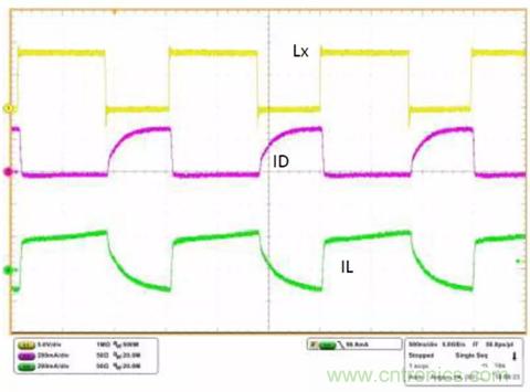 在高壓側開關接通的周期中(圖5中綠色箭頭指示電流),電感器電流斜坡上升,將能量儲存在電感器中,輸出電容器向負載提供電流。在低壓側開關接通的周期中(圖5中紅色箭頭指示電流),電感器電流斜坡下降,向負載提供電流,并為輸出電容器充電。ISL85415EVAL2Z反相降壓-升壓電路板的工作波形如圖6所示。