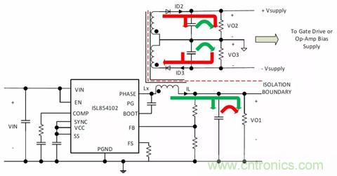 圖3.生成兩個+ VOUT軌的隔離式降壓拓撲(ISL85415DEMO2Z)