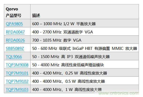 Qorvo 的小信號產品系列線性度高,功耗低,噪音小,尺寸小,極其便于集成。這一系列包括發送線性放大器、增益模塊和可變增益放大器,以及衰減器、開關、濾波器、雙工器和低噪聲放大器。少數此類解決方案包含: