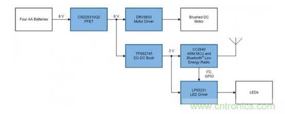 電機(jī)驅(qū)動(dòng)器:驅(qū)動(dòng)電流、電源電壓范圍、負(fù)載電機(jī)類型和安全關(guān)閉功能都是選擇電機(jī)驅(qū)動(dòng)器時(shí)的因素。DRV8833可以驅(qū)動(dòng)多種類型的電機(jī)和感性負(fù)載,峰值電流為2A,電源電壓范圍為2.7V至10.8V,非常適合使用四節(jié)AA電池。標(biāo)稱驅(qū)動(dòng)電壓電池的電壓是5V。
