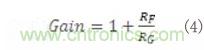 公式4用于計算放大器反饋網絡中的電阻RF和RG的大小,以此來設置公式3中計算出的增益:
