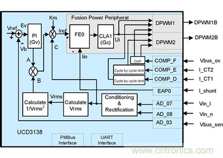 您可以看到固件外部仍有可使用示波器進行監控的模擬信號。另外,您是否注意到方框底部輸出的信號?這些信號將進入 UCD3138 數字控制器并由固件處理,請看下圖。